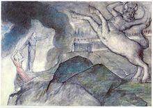 Giovanni Boccaccio writes of the Minotaur in his literary commentary of the Commedia: "When he had grown up and become a most ferocious animal, and of incredible strength, they tell that Minos had him shut up in a prison called the labyrinth, and that he had sent to him there all those whom he wanted to die a cruel death".[27] Dante Gabriel Rossetti, in his own commentary,[28][29] compares the Minotaur with all three sins of violence within the seventh circle: "The Minotaur, who is situated at the rim of the tripartite circle, fed, according to the poem was biting himself (violence against oneself) and was conceived in the 'false cow' (violence against nature, daughter of God)."