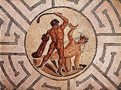 The view of the Minotaur as the antagonist of Theseus reflects the literary sources, which are biased in favour of the Athenian perspectives. The Etruscans, who paired Ariadne with Dionysus, never with Theseus, offered an alternative view, never seen in Greek arts: on an Etruscan red-figure wine-cup of the early-to-mid fourth century Pasiphaë tenderly cradles an infant Minotaur on her knee.[16]
