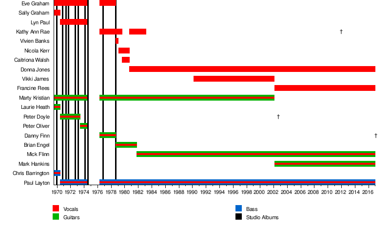 | Past members | Eve Graham Lyn Paul Marty Kristian Peter Doyle Peter Oliver Keith Potger Sally Graham Laurie Heath Chris Barrington Kathy Ann Rae Nicola Kerr Danny Finn Caitriona Walsh Vikki James Brian Engel Vivien Banks |