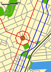 Two other main thoroughfares terminate at the Octagon: Upper and Lower Stuart Streets. Lower Stuart Street is the shorter of the two, leading 600 metres southeast to Dunedin Railway Station and to State Highway 1, which passes through central Dunedin as two parallel one-way streets. Upper Stuart Street climbs steeply to the northwest as a major arterial route to the city's inner hill suburbs and beyond towards Three Mile Hill, one of the routes to the Taieri Plains and South Otago. Surrounding the Octagon is a larger octagonal street, Moray Place.