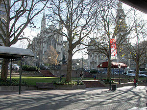 The Octagon is the city centre of Dunedin, in the South Island of New Zealand. It is an eight-sided plaza with a circular one-way carriageway, bisected by the city's main street, and is also the central terminus of two other main thoroughfares. The Octagon is predominantly a pedestrian reserve, with grass and paved features, and is surmounted by a statue of the Scottish poet Robert Burns. Several of Dunedin's significant buildings and institutions adjoin the plaza, which is also a major hub for public transport in Dunedin.