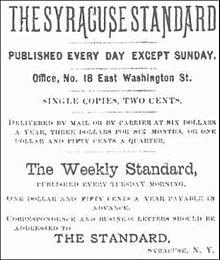 By 1900, Syracuse had a population of 135,000 and the publication had a "sworn circulation" of 17,575 daily, 12,571 semi-weekly and 15,195 on Sunday. It was touted as "a clean, wholesome, aggressive, up-to-date newspaper."[3] The newspaper bragged that "The Post-Standard has a larger circulation than any other daily paper between Greater New York and Rochester."[3]