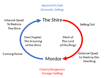 The chapter follows all the main action of The Lord of the Rings. The story tells how the One Ring, a ring of power made by the Dark Lord Sauron, lost for many centuries, has reappeared, and is in the hands of a hobbit, Frodo Baggins, in the England-like[1] Shire. If Sauron finds the Ring, he will use it to take over the whole of Middle-earth. A Wizard, Gandalf, tells Frodo the history of the ring and persuades him to leave the Shire to destroy the Ring. He is joined by three other hobbits, his friends Sam, Merry, and Pippin. They are pursued by Sauron's Black Riders, but escape to a stronghold of the Elves, Rivendell. There, they learn that it can only be destroyed in the volcano, Mount Doom, where Sauron forged the Ring, in the evil land of Mordor. They are joined by others opposed to Sauron, forming a Fellowship of the Ring, led by Gandalf. They face many perils on the journey, and the Fellowship is split up. Merry and Pippin become involved in wars against the evil Wizard Saruman and then against Sauron: Merry becomes a knight of Rohan, while Pippin becomes a guard of Gondor. With Sauron distracted, Frodo and Sam manage to travel to Mount Doom. The Ring is destroyed in the Cracks of Doom, and Sauron is overthrown. The hobbits, much changed by their experiences, ride home to the Shire, hoping to return to a peaceful rural life.[2]
