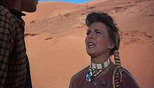 The rape of captive white women by the Comanche is an unspoken theme. No actual rape scene is depicted, but Alexandra Heller-Nicholas in her study of Rape-Revenge Films says, "the abduction, captivity, and implied rape of Debbie (Natalie Wood) ... drives the narrative";[35] and Edward Buscombe points out a scene in which "... [Ethan] turns off the trail to penetrate a narrow crevice in the rocks, and when he emerges, his savage stabbing with his knife seems to mimic a violent sexual act, drawing us 'a picture' of the act of rape which obsesses him."[36] Glenn Frankel writes that in real life, "Rape was a fact of life for many captives, although it was seldom discussed by those women who escaped or were ransomed back to the white world."[37]