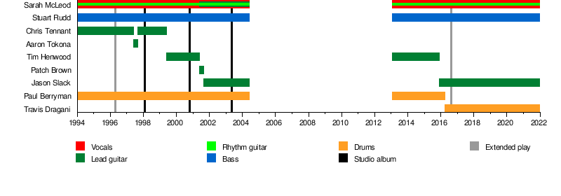 - Sarah McLeod – lead vocals, guitar (1994–2004, 2013–present)