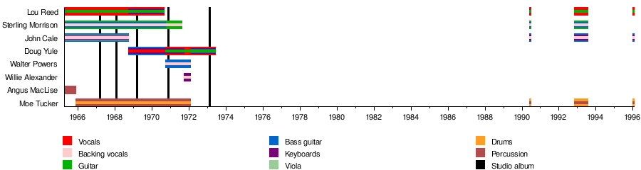 The foundations for what would become the Velvet Underground were laid in late-1964. Singer-songwriter and guitarist Lou Reed had performed with a few short-lived garage bands and had worked as a songwriter for Pickwick Records (Reed described his tenure there as being "a poor man's Carole King").[11] Reed met John Cale, a Welshman who had moved to the United States to study classical music upon securing a Leonard Bernstein scholarship. Cale had worked with experimental composers John Cage, Cornelius Cardew and La Monte Young, and had performed with Young's Theatre of Eternal Music, though was also interested in rock music.[12] Young's use of extended drones would be a profound influence on the band's early sound. Cale was pleasantly surprised to discover that Reed's experimentalist tendencies were similar to his own: Reed sometimes used alternative guitar tunings to create a droning sound. The pair rehearsed and performed together; their partnership and shared interests built the path towards what would later become the Velvet Underground.