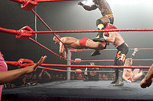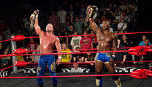 The following week, on February 6, they won the WWE Tag Team Championship by defeating Los Guerreros.[6] They continued their rivalry with Benoit, facing him and Brock Lesnar at No Way Out in a handicap match, where they teamed with their mentor Angle in a losing effort.[7] After a successful title defense at WrestleMania XIX against Los Guerreros and the team of Chris Benoit and Rhyno, Team Angle lost the championship to Eddie Guerrero and his new partner Tajiri at Judgment Day on May 18 in a ladder match.[8][9] Shortly afterwards, on June 12, Angle confronted Benjamin and Haas about the losing streak they had been in for a couple of weeks, and, after they blamed him for losing the Tag Team Championship and began to question his leadership, he fired them both from Team Angle.[5][10] For a few weeks they wrestled against Angle, both in singles matches and in tag team matches.[11][12]