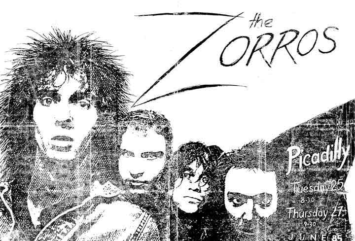 The Zorros were popular in the Melbourne music scene of the early 1980s, playing at numerous local venues such as the Crystal Ballroom, Bombay Rock, Brunswick and The Esplanade, St Kilda. In October 1981 released a 7" single on Au Go Go Records, "Too Young",[3][5] written by Chancellor.[6] It was mixed and produced by Tony Cohen (The Birthday Party),[7][8] which went to number 3 on the Melbourne 3RRR charts.[9]