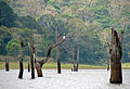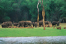 The Periyar Wildlife Sanctuary is spread across 777 km2 (300 sq mi), of which 360 km2 (140 sq mi) is thick evergreen forest. The wildlife sanctuary was declared a tiger reserve in 1978. The splendid artificial lake formed by the Mullaperiyar Dam across the Periyar River adds to the charm of the park. The greatest attractions of Periyar are the herds of wild elephants, deer and bison that come down to drink in the lake. The sanctuary can be accessed by trekking, boating or jeep safari. [3]