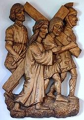 Several commentators have seen Gandalf's passage through the Mines of Moria, dying to save his companions and returning as "Gandalf the White", as a symbol of the resurrection of Christ.[46][53][48][54] Like Jesus who carried his cross for the sins of mankind, Frodo carried a burden of evil on behalf of the whole world.[55] Frodo walks his "Via Dolorosa" to Mount Doom just like Jesus who made his way to Golgotha.[56] As Frodo approaches the Cracks of Doom, the Ring becomes a crushing weight, just as the cross was for Jesus. Sam Gamgee, Frodo's servant, who carries Frodo up to Mount Doom, parallels Simon of Cyrene, who helps Jesus by carrying his cross to Golgotha.[52] When Frodo accomplishes his mission, like Christ, he says "it is done".[57] Just as Christ ascends to heaven, Frodo's life in Middle-earth comes to an end when he departs to the Undying Lands.[55]