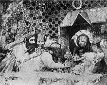 In 1359 he is mentioned as "malerius imperatoris" and owner of a house in Hradčany in the Records of the Hradčany town.[10] His house was mentioned once again in 1368 (house no. 185/IV above Úvoz on Hradčany Square.[11] Between 1359 and 1367 he worked as the leading court painter of Charles IV in Prague and at Karlštejn Castle. The emperor called his painter and courtier Pictor noster et familiaris. In a special document of 28 April 1367, Charles IV certified that Theodoric’s court and fields in the village of Mořina would be freed of all taxes and other charges. This privilege also applied to Theodoric’s heirs and was granted in recognition of his decoration of the royal chapel at Karlštejn.[1] Theodoric’s court was mentioned again in 1381, when it was sold, in a letter by Wenceslaus IV. Mikuláš Mendl of Jílové, father of the goldsmith Jorg, and the goldsmith Jan Waczenser, sold the court to Zdena, the widow of Ješek Mráz of Lazevice. This document is the only one that establishes Theodoric’s death before the 8th March 1381 and indicates that he left no descendants.[12][13]
