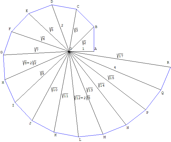 Theodorus here was drawing some figures for us in illustration of roots, showing that squares containing three square feet and five square feet are not commensurable in length with the unit of the foot, and so, selecting each one in its turn up to the square containing seventeen square feet and at that he stopped.[4]