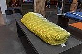A Therm-a-Rest self-inflating mattress consists of an airtight nylon fabric envelope filled with a sheet of low density, open-cell polyurethane foam. When a valve is opened the foam expands and draws air into the mattress. When the mattress has fully inflated, the user simply closes the valve. To increase firmness a few breaths of air can be blown into the mattress. To pack the mattress the valve is opened and it is rolled up tightly to force the air out, whereupon the valve is closed to prevent re-inflation.