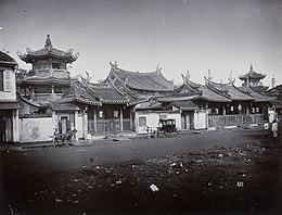 In 1840, the clan association Hokkien Huay Kuan serving the Hokkien community was formed within the temple ground of Thian Hock Keng.[2] In 1849, the Chung Wen Pagoda and Chong Boon Gate were added to the right of the main temple. The building was renovated in 1906, and some 'western-style' features were added, such as a wrought-iron gate from Glasgow and dado tiling.[6] A scroll was presented to the temple by Guangxu Emperor to the temple in 1907. The Chong Hock Pavilion was built in 1913, and was once used by the Chong Hock Girls' School established in the temple.[7]