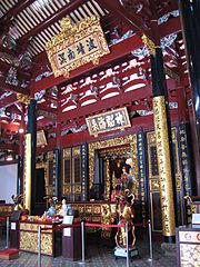 A smaller shrine to Guanyin, the Goddess of Mercy, is located at the back. Other deities worshiped in the temple include the God of Medicine and Health (保生大帝, Baosheng Dadi), Holy Emperor Lord Guan (關聖帝君, Guansheng Dijun, worshipped for spiritual protection), the Sacred Duke Kai Zhang (開漳聖王, Kai Zhang Sheng Wang), the Boddhisattva Sangharama (伽藍菩薩, Qie Lan Pu Sa) and the City God (城隍爺, Cheng Huang Ye). Confucius is also venerated in the temple.[2][10]