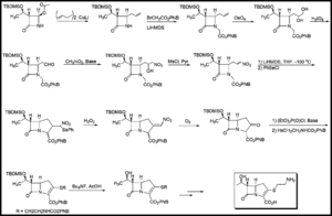 - ^ Tatsuta K, Takahashi M, Tanaka N, Chikauchi K (2000). "Novel synthesis of (+)-4-acetoxy-3-hydroxyethyl-2-azetidinone from carbohydrate. A formal total synthesis of (+)-thienamycin". J. Antibiot. 53 (10): 1231–4. doi:10.7164/antibiotics.53.1231. PMID 11132974.