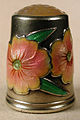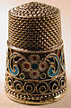 Advanced thimblemakers enhanced thimbles with semi-precious stones to adorn the apex or along the outer rim. Cabochon adornments are sometimes made of cinnabar, agate, moonstone, or amber. Thimble artists would also utilize enameling, or the Guilloché techniques advanced by Peter Carl Fabergé.[4]