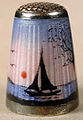 On December 3, 1979, a London dealer bid the sum of $18,000 USD for a dentil shaped Meissen porcelain thimble, circa 1740, at Christie's auction in Geneva, Switzerland. The thimble, just over a half inch high, was painted in a rare lemon-yellow color about the band. It also had tiny harbor scene hand painted within gold-trimmed cartouches. The rim was scalloped with fired gold on its bottom edge. The thimble now belongs to a Meissen collector in Canada who wanted it for its lemon-yellow color.[19]