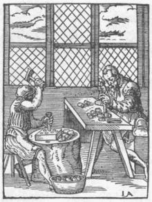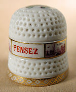 Early Meissen porcelain and elaborate, decorated gold thimbles were also given as 'keepsakes' and were usually quite unsuitable for sewing. This tradition has continued to the present day. In the early modern period, thimbles were used to measure spirits, and gunpowder, which brought rise to the phrase "just a thimbleful". Prostitutes used them in the practice of thimble-knocking where they would tap on a window to announce their presence.[6] Thimble-knocking also refers to the practice of Victorian schoolmistresses who would tap on the heads of unruly pupils with dames thimbles.[7]