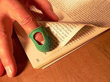 A variation on the thimble used by sailmakers and leather workers is the sewing palm, known by various others names such as seaming palm, sail palm, sailmaker's palm or roping palm.[13][14] This item consists of a pitted hard plate set into a stiff leather band that is worn around the palm of the hand, with the plate resting against the first joint of the thumb. It is used by grasping a needle between the thumb and indexing finger, with the eye end of the needle against the pitted plate, and pushing the needle with the entire arm.[15] This design permits the sewer to exert a great amount of force when pushing thick needles through very tough materials such as sail cloth, canvas or leather.[16]