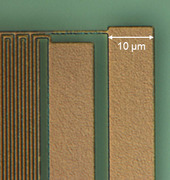 Thin layers from elemental metals like copper, aluminum, gold or silver etc. and alloys have found numerous applications in electrical devices. Due to their high electrical conductivity they are able to transport electrical currents or supply voltages. Thin metal layers serve in conventional electrical system, for instance, as Cu layers on printed circuit boards, as the outer ground conductor in coaxial cables and various other forms like sensors etc.[14] A major field of application became their use in integrated passive devices and integrated circuits, where the electrical network among active and passive devices like transistors and capacitors etc. is built up from thin Al or Cu layers. These layers dispose of thicknesses in the range of a few 100 nm up to a few µm, and they are often embedded into a few nm thin titanium nitride layers in order to block a chemical reaction with the surrounding dielectric like SiO2. The figure shows a micrograph of a laterally structured TiN/Al/TiN metal stack in a microelectronic chip.[13]
