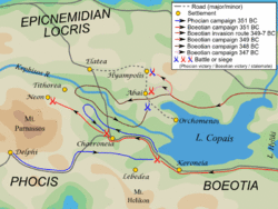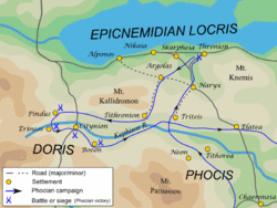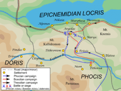 The following spring, possibly upon hearing news that the Boeotians were ready to march against Phocis, Philomelos took the initiative and marched into Epicnemidian Locris.[28] Since the Phocian army would be outnumbered by the whole Amphictyonic levy, it is probable that he sought to defeat his enemies one by one, starting with the Locrians.[28] If he could defeat the Locrians, then he was in a position to occupy the narrow pass of Thermopylae and block the union of the Thessalian and Boeotian armies, the main Amphictyonic contingents.[28] Philomelos's army thus crossed into Locris, probably using the Fontana pass from Triteis to Naryx, or possibly the Kleisoura pass from Tithronion to the same general area of Locris. The Locrians sent a force of cavalry to oppose him, which the Phocians easily defeated.[28] However, this battle gave the Thessalians time to pass through Thermopylae and arrive in Locris. Philomelos immediately attacked the Thessalians, and defeated them near the town of Argolas, whose location is not definitively known. Buckler suggests, on the basis of topographical considerations, that the modern village of Mendenitsa must be ancient Argolas.[28]