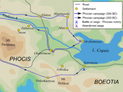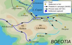 Philip had not involved himself in the Sacred War since his victory at the Crocus Field in 352 BC. In the meantime, it had become clear that the Sacred War could only be ended by outside intervention.[61] The Phocians had occupied several Boeotian cities, but were running out of treasure to pay their mercenaries; conversely, the Thebans were unable to act effectively against the Phocians.[61] The Phocian general Phalaikos was removed from his command in 347 BC, and three new generals appointed, who successfully attacked Boeotia again.[62]