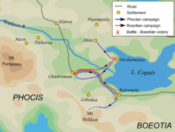 The Amphictyons seem to have concluded that their victory at Neon had effectively ended the war, and the Phocians would sue for peace.[30] Otherwise, it is difficult to understand why Pammenes did not march on Delphi, or even sack the undefended Phocian cities in the Kephisos valley.[30] In failing to follow up their victory, the Amphictyons wasted the best opportunity they had during the course of the war to end it.[30] The Thebans seem to have been so sure that the war was ended that they agreed to send 5,000 hoplites under Pammenes to help the rebellion of the Persian satrap Artabazus, shortly after the Battle of Neon.[31] The Thebans needed the money Artabazos offered them, and although they had generally been on good terms with the Persian king, they obviously felt the offer was too good to refuse.[31] It is likely the troops were dispatched before the Phocian decision to fight on became clear, unless the Thebans thought that their remaining troops were a match for any army the Phocians could field.[32] This was to prove a serious mistake for the Thebans, and the Amphictyonic cause in general.[32]