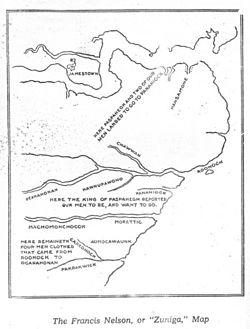 Smith ventured into the Chesapeake Bay twice more in 1608, in the months between the first and second supply missions, charged by the Company to search for gold and a passage to the Pacific Ocean. The first trip lasted from June 2 to July 21; a second, longer expedition spanned July 24 to September 7.[13] Searching for badly needed food, he covered an estimated 3,000 miles (4,828 km), producing a map (see image) that was of great value to local explorers for more than a century.[12] This time he successfully traded for food with the Nansemonds along the Nansemond River, and several other groups. He had mixed results dealing with the various other tribes, most of whom were affiliated with the Powhatan Confederacy. These explorations were later commemorated in the Captain John Smith Chesapeake National Historic Trail, established in 2006.
