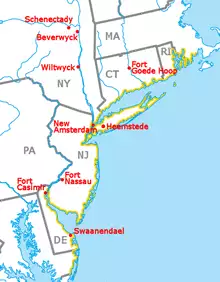 Beginning in 1609, Dutch traders explored and established fur trading posts on the Hudson River, Delaware River, and Connecticut River, seeking to protect their interests in the fur trade. The Dutch West India Company established permanent settlements on the Hudson River, creating the Dutch colony of New Netherland. In 1626, Peter Minuit purchased the island of Manhattan from the Lenape Indians and established the outpost of New Amsterdam.[14] Relatively few Dutch settled in New Netherland, but the colony came to dominate the regional fur trade.[15] It also served as the base for extensive trade with the English colonies, and many products from New England and Virginia were carried to Europe on Dutch ships.[16] The Dutch also engaged in the burgeoning Atlantic slave trade, taking enslaved Africans to the English colonies in North America and Barbados.[17] The West India Company desired to grow New Netherland as it became commercially successful, yet the colony failed to attract the same level of settlement as the English colonies did. Many of those who did immigrate to the colony were English, German, Walloon, or Sephardim.[18]