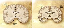 Dementia becomes more common with age.[44] About 3% of people between the ages of 65 and 74, 19% between 75 and 84, and nearly half of those over 85 years of age have dementia.[45] The spectrum ranges from mild cognitive impairment to the neurodegenerative diseases of Alzheimer's disease, cerebrovascular disease, Parkinson's disease and Lou Gehrig's disease. Furthermore, many types of memory decline with ageing, but not semantic memory or general knowledge such as vocabulary definitions, which typically increases or remains steady until late adulthood[46] (see Ageing brain). Intelligence declines with age, though the rate varies depending on the type and may in fact remain steady throughout most of the lifespan, dropping suddenly only as people near the end of their lives. Individual variations in rate of cognitive decline may therefore be explained in terms of people having different lengths of life.[47] There are changes to the brain: after 20 years of age there is a 10% reduction each decade in the total length of the brain's myelinated axons.[48][49]