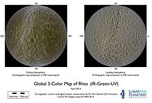 The extensive dark areas on the trailing hemisphere of Saturn's moon Rhea are thought to be deposited tholins.[14]