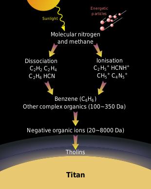 4) by energetic particles and solar radiation. This is followed by the formation of ethylene, ethane, acetylene, hydrogen cyanide, and other small simple molecules and small positive ions. Further reactions form benzene and other organic molecules, and their polymerization leads to the formation of an aerosol of heavier molecules, which then condense and precipitate on the planetary surface below.[11] Tholins formed at low pressure tend to contain nitrogen atoms in the interior of their molecules, while tholins formed at high pressure are more likely to have nitrogen atoms located in terminal positions.[12][13]