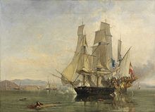 On 23 July 1793, aged 17, Cochrane joined the navy as a midshipman, spending his first months at Sheerness in the 28-gun sixth-rate frigate HMS Hind commanded by his uncle Captain Alexander Cochrane.[9] He transferred to the 38-gun fifth rate HMS Thetis, also under his uncle's command. While aboard Thetis, he visited Norway and next served on the North America Station.[10] In 1795, he was appointed acting lieutenant. The following year on 27 May 1796, he was commissioned lieutenant after passing the examination.[10] After several transfers in North America and a return home in 1798, he was assigned as 8th Lieutenant on Lord Keith's flagship HMS Barfleur in the Mediterranean.[11]