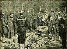 The question of Cochrane's innocence or guilt created much debate at the time, and it has divided historians ever since.[33] Subsequent reviews of the trial carried out by three Lord Chancellors during the course of the 19th century concluded that Cochrane should have been found not guilty on the basis of the evidence produced in court.[34] Cochrane maintained his innocence for the rest of his life and campaigned tirelessly to restore his damaged reputation and to clear his name. He believed that the trial was politically motivated and that a "higher authority than the Stock Exchange" was responsible for his prosecution.[32] A series of petitions put forward by Cochrane protesting his innocence were ignored until 1830. That year, King George IV (the former Prince Regent) died and was succeeded by William IV. He had served in the Royal Navy and was sympathetic to Cochrane's cause.[35] Later that year, the Tory government fell and was replaced by a Whig government in which his friend Lord Brougham was appointed Lord Chancellor.[35] Following a meeting of the Privy Council in May 1832, Cochrane was granted a pardon and restored to the Navy List with a promotion to rear-admiral.[36][37] Support from friends in the government and the writings of popular naval authors such as Frederick Marryat and Maria Graham increased public sympathy for Cochrane's situation. Cochrane's knighthood was restored in May 1847 with the personal intervention of Queen Victoria, and he was appointed Knight Grand Cross of the Order of the Bath.[38][39][40] Only in 1860 was his banner returned to Westminster Abbey; it was the day before his funeral.[37]