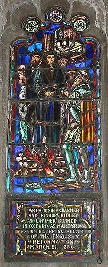 Cranmer's greatest concerns were the maintenance of the royal supremacy and the diffusion of reformed theology and practice. But he is best remembered for his contribution to the realm of language and of cultural identity.[103] His prose helped to guide the development of the English language and the Book of Common Prayer is a major contribution to English literature that influenced many lives in the Anglophone world. It was the vehicle that guided Anglican worship for four hundred years.[104] Catholic biographers sometimes depict Cranmer as an unprincipled opportunist, a Nicodemite,[105] and a tool of royal tyranny. For their part, hagiographic Protestant biographers sometimes overlook the times that Cranmer betrayed his own principles.[106] Yet both sides can agree that Cranmer was a committed scholar whose life showed the strengths and weaknesses of a very human and often under-appreciated reformer.[107] He is commemorated in the Anglican Communion as a Reformation Martyr on 21 March, the anniversary of his death.[108]