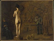Recent scholarship suggests that these scandals were grounded in more than the "puritanical prudery" of his contemporaries—as had once been assumed—and that Eakins' progressive academic principles may have protected unconscious and dubious agendas.[97] These controversies may have been caused by a combination of factors such as the bohemianism of Eakins and his circle (in which students, for example, sometimes modeled in the nude for each other), the intensity and authority of his teaching style, and Eakins' inclination toward unorthodox or provocative behavior.[98][99]