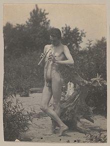 The so-called "Naked Series", which began in 1883, were nude photos of students and professional models which were taken to show real human anatomy from several specific angles, and were often hung and displayed for study at the school. Later, less regimented poses were taken indoors and out, of men, women, and children, including his wife. The most provocative, and the only ones combining males and females, were nude photos of Eakins and a female model (see below). Although witnesses and chaperones were usually on site, and the poses were mostly traditional in nature, the sheer quantity of the photos and Eakins' overt display of them may have undermined his standing at the Academy.[40] In all, about eight hundred photographs are now attributed to Eakins and his circle, most of which are figure studies, both clothed and nude, and portraits.[41] No other American artist of his time matched Eakins' interest in photography, nor produced a comparable body of photographic works.[42]