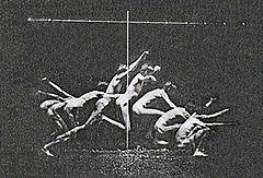 In the late 1870s, Eakins was introduced to the photographic motion studies of Eadweard Muybridge, particularly the equine studies, and became interested in using the camera to study sequential movement.[35] In the mid-1880s, Eakins worked briefly alongside Muybridge in the latter's photographic studio at the University of Pennsylvania in Philadelphia.[36] Eakins soon performed his own independent motion studies, also usually involving the nude figure, and even developed his own technique for capturing movement on film.[37] Whereas Muybridge's system relied on a series of cameras triggered to produce a sequence of individual photographs, Eakins preferred to use a single camera to produce a series of exposures superimposed on one negative.[38] Eakins was more interested in precision measurements on a single image to aid in translating a motion into a painting, while Muybridge preferred separate images that could also be displayed by his primitive movie projector.[36]