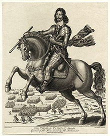 Thomas Fairfax, 3rd Lord Fairfax of Cameron (17 January 1612 – 12 November 1671), also known as Sir Thomas Fairfax,[1] was an English nobleman, peer, politician, general, and Parliamentary commander-in-chief during the English Civil War. An adept and talented commander, Fairfax led Parliament to many victories, notably the crucial Battle of Naseby, becoming effectively military ruler of England, but was eventually overshadowed by his subordinate Oliver Cromwell, who was more politically adept and radical in action against Charles I. Fairfax became unhappy with Cromwell's policy and publicly refused to take part in Charles's show trial. Eventually he resigned, leaving Cromwell to control the country. Because of this, and also his honourable battlefield conduct and his active role in the Restoration of the monarchy after Cromwell's death, he was exempted from the retribution exacted on many other leaders of the revolution. His dark hair and eyes and a swarthy complexion earned him the nickname "Black Tom".[2]
