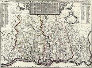 Holme designed the plan of the city of Philadelphia and produced the first detailed map of Pennsylvania, entitled "A Mapp of Ye Improved Part of Pensilvania in America, Divided Into Countyes, Townships and Lotts...." (published circa 1687).[2] On Penn's arrival in the colony, he appointed Holme as one of his councilors. Holme also served as a justice of the peace and commissioner of property.[1]