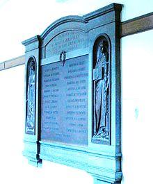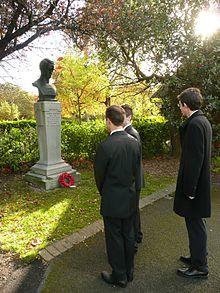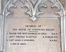 The erection by of a commemorative bronze bust of Kettle in Dublin, commissioned from the sculptor Albert Power and finished in 1921,[28] was beset for almost twenty years by controversy and bureaucratic obstruction due to the antipathy of the State authorities post-Independence towards Irishmen who had fought in World War I. It was finally raised in 1937, without an unveiling ceremony, in St. Stephen's Green.[29][30] A stone tablet commemorates him in the Island of Ireland Peace Park, at Messines, Belgium and he is listed on the bronze plaque in the Four Courts Dublin which commemorates the 26 Irish barristers killed in the Great War. Kettle is commemorated on Panel 1 of the Parliamentary War Memorial in Westminster Hall in London, one of 22 present and former Members of Parliament that lost their lives during World War I to be named on that memorial.[31][32] A further act of commemoration came with the unveiling in 1932 of a manuscript-style illuminated book of remembrance for the House of Commons, which includes a short biographical account of the life and death of Kettle.[33][34]