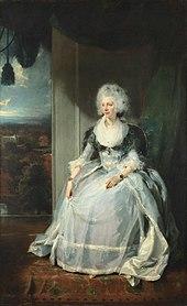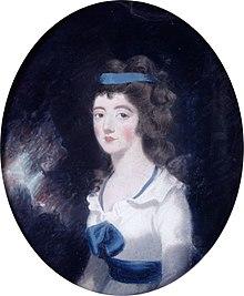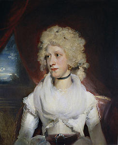 Sometime before his eighteenth birthday in 1787 Lawrence arrived in London, taking lodgings in Leicester Square, near to Joshua Reynolds' studio. He was introduced to Reynolds, who advised him to study nature, rather than the Old Masters. Lawrence set up a studio at 41 Jermyn Street and installed his parents in a house in Greek Street. He exhibited several works in the 1787 Royal Academy exhibition at Somerset House, and enrolled as a student at the Royal Academy but did not stay long, abandoning the drawing of classical statues to concentrate on his portraiture. In the Royal Academy exhibition of 1788 Lawrence was represented by five portraits in pastels and one in oils, a medium he quickly mastered. Between 1787 and his death in 1830 he would miss only two of the annual exhibitions: once, in 1809, in protest about the way his paintings had been displayed and once, in 1819, because he was abroad. In 1789 he exhibited 13 portraits, mostly in oil, including one of William Linley and one of Lady Cremorne, his first attempt at a full-length portrait.[10] The paintings received favourable comments in the press with one critic referring to him as "the Sir Joshua of futurity not far off" and, aged just twenty, Lawrence received his first royal commission, a summons arriving from Windsor Palace to paint the portraits of Queen Charlotte and Princess Amelia.[11] The queen found Lawrence presumptuous (although he made a good impression on the princesses and ladies-in-waiting) and she did not like the finished portrait, which remained in Lawrence's studio until his death. When it was exhibited at the Royal Academy in 1790, however, it received critical acclaim.[12] Also shown that year was another of Lawrence's most famous portraits, that of the actress Elizabeth Farren, soon to be the Countess of Derby, "completely Elizabeth Farren: arch, spirited, elegant and engaging", according to one newspaper.[13]