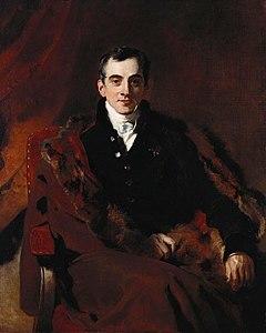 Lawrence arrived back in London 30 March 1820 to find that the president of the Royal Academy, Benjamin West, had died. That very evening Lawrence was voted the new president, a position he would hold until his death 10 years later. George III had died in January; Lawrence was granted a place in the procession for the coronation of George IV. On 28 February 1822 he was elected as a Fellow of the Royal Society "for his eminence in art".[27] The royal commissions continued during the 1820s, including one for a portrait of the king's sister Sophia, and one of Sir Walter Scott (along with Jane Austen, one of Lawrence's favourite authors), as well as one to paint King Charles X of France for the Waterloo series, for which Lawrence made a trip to Paris, taking Herman Wolff with him.[28] Lawrence acquired another important patron in Robert Peel, who commissioned the painter to do portraits of his family as well a portrait of George Canning. Two of Lawrence's most famous portraits of children were painted during the 1820s: that of Emily and Laura Calmady and that of Master Charles William Lambton, painted for his father Lord Durham for 600 guineas and known as The Red Boy. The latter portrait attracted much praise when it was exhibited in Paris in 1827.[29] One of the artist's last commissions was of future prime-minister the Earl of Aberdeen. Fanny Kemble, a niece of Sarah Siddons, was one of his last sitters (for a drawing).