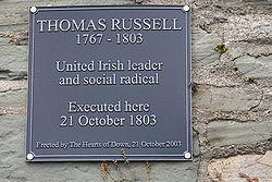 Russell managed to hide for a number of weeks but Dublin was caught in the authorities' dragnet on 9 September. He was sent under heavy escort to Downpatrick Gaol. There, convicted of high treason, on 12 October he was hung and beheaded. His remains were buried in the graveyard of the parish church, Down Cathedral, a grave paid for by his friend Mary Ann McCracken.