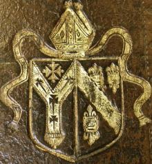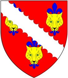 The personal coat of arms of Archbishop Tenison consist of the arms of the see of Canterbury impaled with the Tenison family arms. The former, placed on the dexter side of honour, are blazoned as: Azure, an archiepiscopal cross in pale or surmounted by a pall proper charged with four crosses patee fitchee sable. The arms of Tenison, placed on the sinister side of the escutcheon are blazoned as: Gules, a bend engrailed argent voided azure, between three leopard's faces or jessant-de-lys azure. In standard English: a red field bearing a white (or silver) diagonal band with scalloped edges, and a narrower blue band running down its centre. This lies between three gold heraldic lion's faces, each of which is pierced by a fleur-de-lys entering through the mouth.