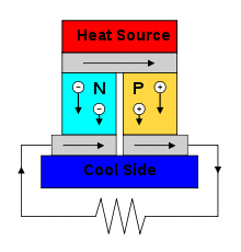 The thermoelectric effect is the direct conversion of temperature differences to electric voltage and vice versa via a thermocouple.[1] A thermoelectric device creates a voltage when there is a different temperature on each side. Conversely, when a voltage is applied to it, heat is transferred from one side to the other, creating a temperature difference. At the atomic scale, an applied temperature gradient causes charge carriers in the material to diffuse from the hot side to the cold side.