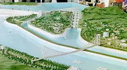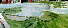 In 1944, the United States Bureau of Reclamation chief design engineer, John L. Savage, surveyed the area and drew up a dam proposal for the 'Yangtze River Project'.[17] Some 54 Chinese engineers went to the U.S. for training. The original plans called for the dam to employ a unique method for moving ships; the ships would move into locks located at the lower and upper ends of the dam and then cranes with cables would move the ships from one lock to the next. In the case of smaller water craft, groups of craft would be lifted together for efficiency. It is not known whether this solution was considered for its water-saving performance or because the engineers thought the difference in height between the river above and below the dam too great for alternative methods.[18] Some exploration, survey, economic study, and design work was done, but the government, in the midst of the Chinese Civil War, halted work in 1947.
