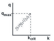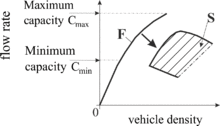 In free traffic flow, empirical data show a positive correlation between the flow rate (in vehicles per unit time) and vehicle density (in vehicles per unit distance). This relationship stops at the maximum free flow with a corresponding critical density . (See Figure 1.)
