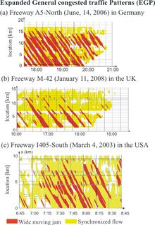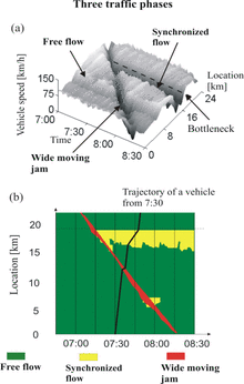 Measured data of averaged vehicle speeds (Figure 3 (a)) illustrate the phase definitions [J] and [S]. There are two spatial-temporal patterns of congested traffic with low vehicle speeds in Figure 3 (a). One pattern propagates upstream with almost constant velocity of the downstream front, moving straight through the freeway bottleneck. According to the definition [J], this pattern of congestion belongs to the "wide moving jam" phase. In contrast, the downstream front of the other pattern is fixed at a bottleneck. According to the definition [S], this pattern belongs to the "synchronized flow" phase (Figure 3 (a) and (b)). Other empirical examples of the validation of the traffic phase definitions [J] and [S] can be found in the books[4] and,[5][6] in the article[7] as well as in an empirical study of floating car data[8] (floating car data is also called probe vehicle data).